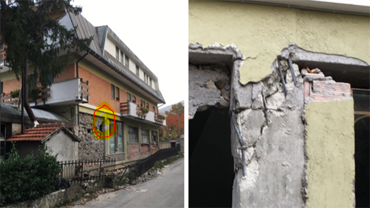 תמונה 29a,b: דוגמאות לכשלים בצמתים עקב פרטים לא משיכים במבני מגורים שלודים באמטריצ'ה. בתמונה התחתונה נזק גדול יותר בכיוון הארוך: מזרח-מערב, 26/10/16